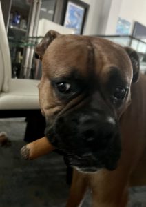 Recently I’ve decided that Art is my passion as well… and I’ve convinced ‘The Artist’ to hire me. We are still in negotiations for my pay 🦴- wish me luck. How do you like my distinguished ‘cigar’ look? I think it’s going to be a ‘ladypup magnet’ – Gotta run! 🐾