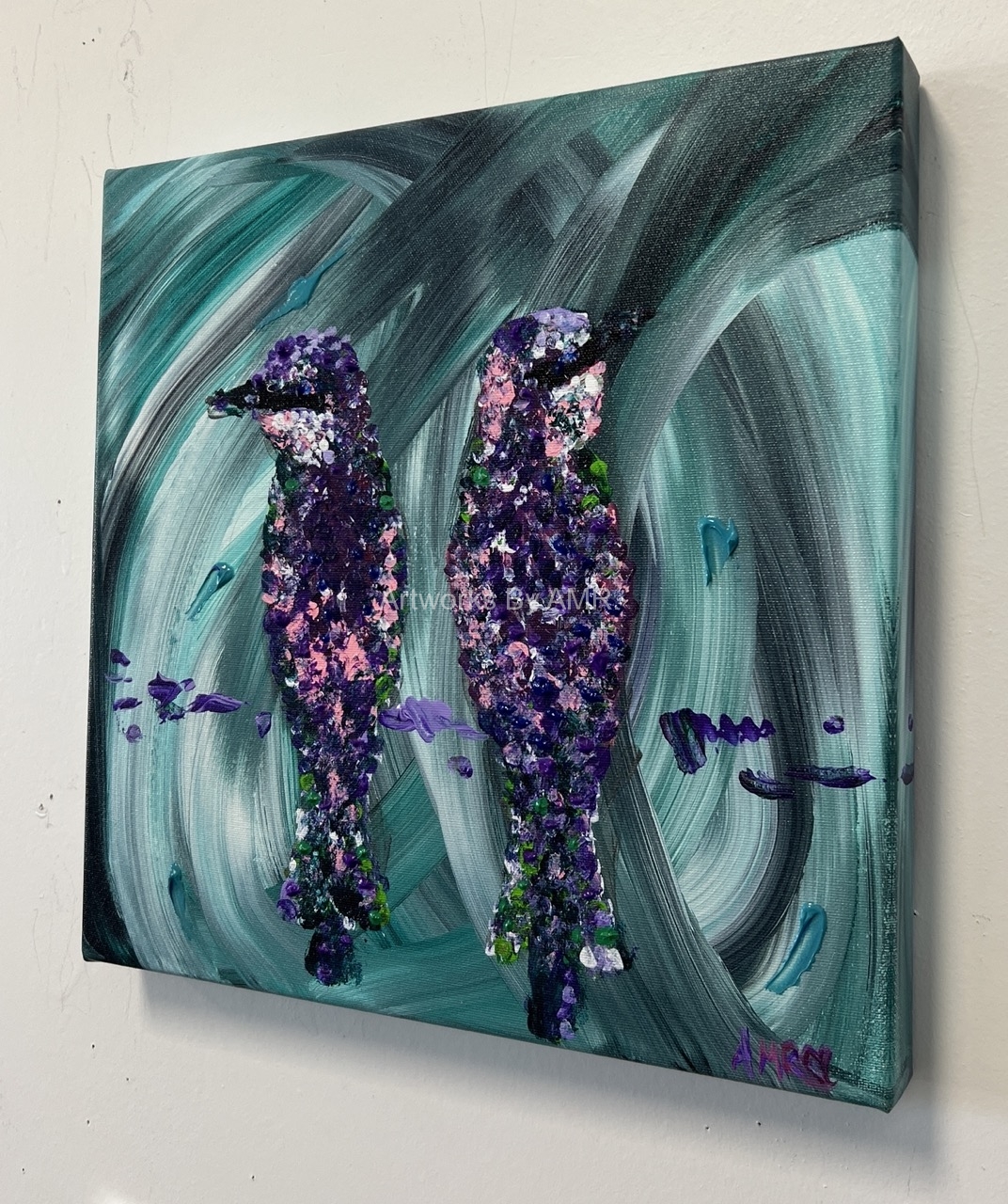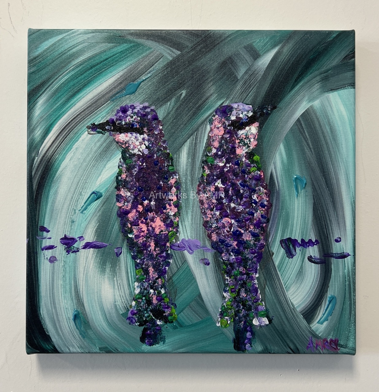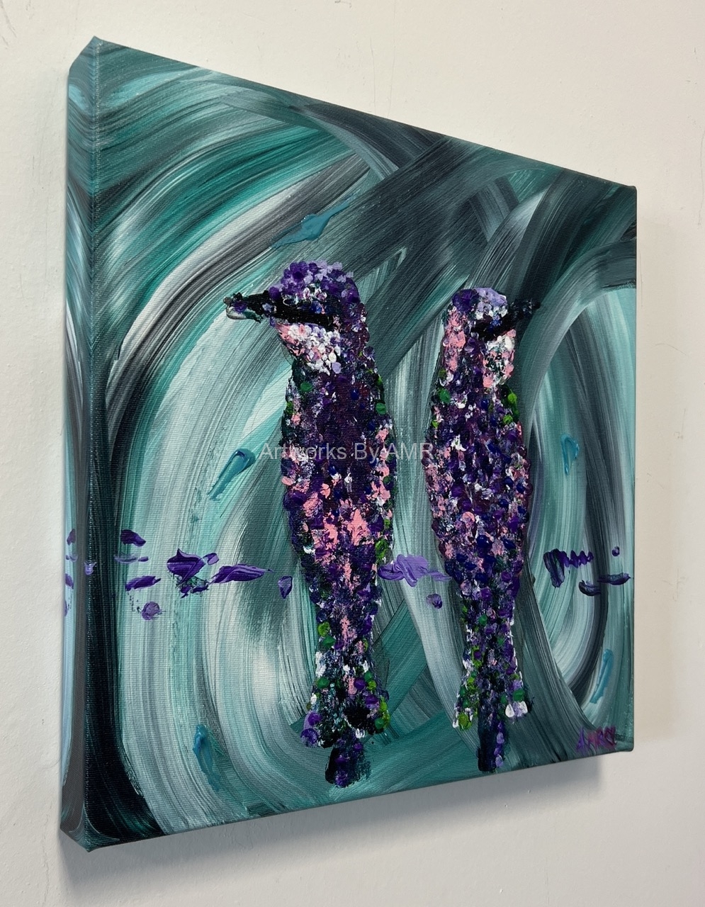 This painting was inspired from a feeling of calm, and an inspiration of beauty. Occasionally my painting style is in pointillism – and that was the way these Tropical Birds appeared on my canvas.