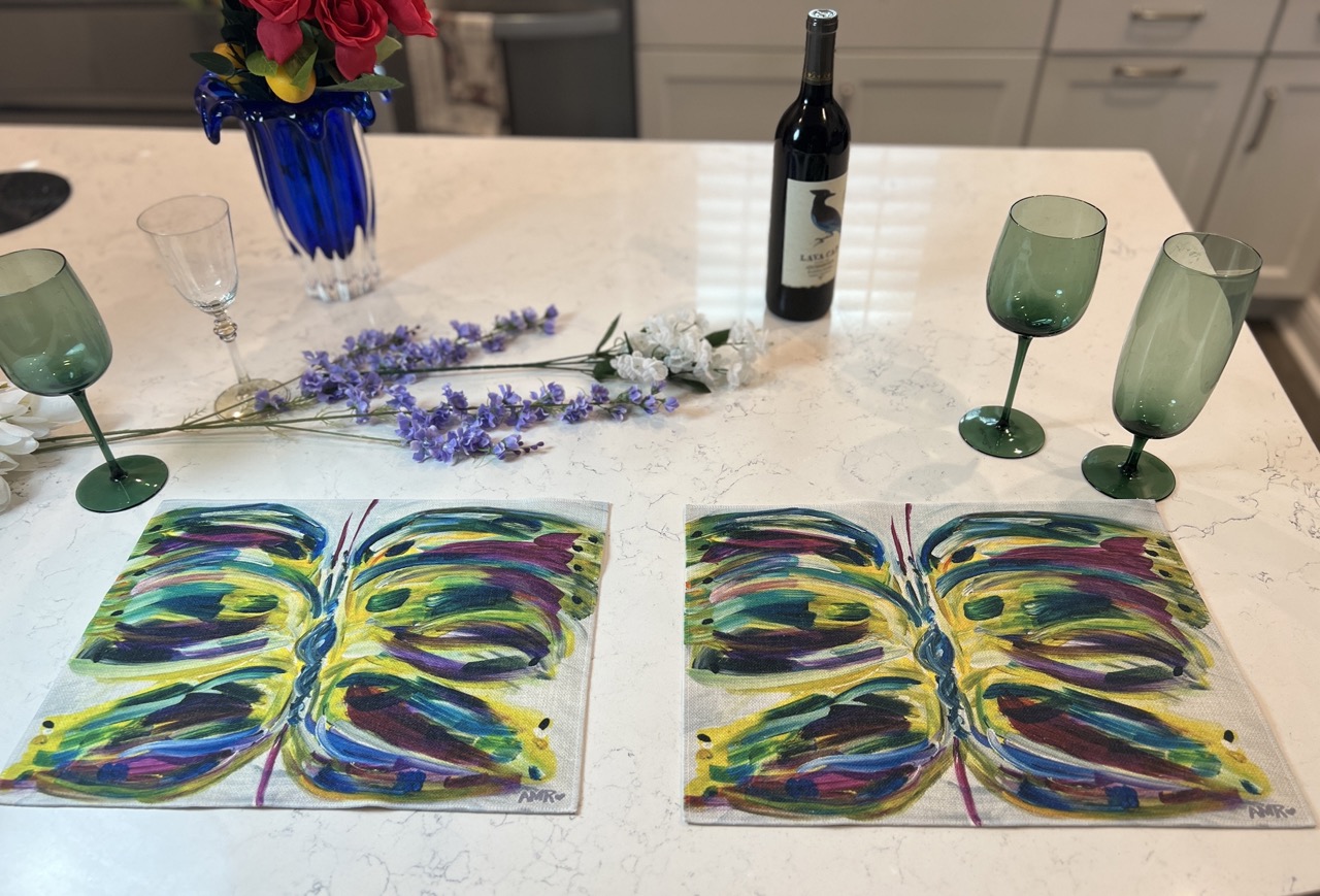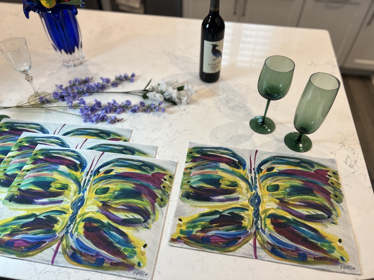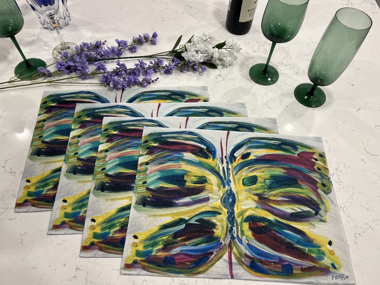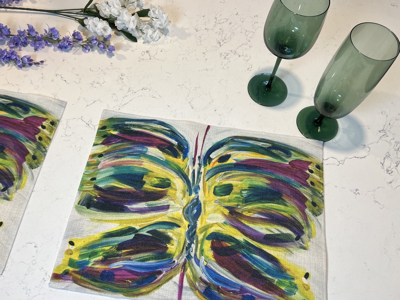 Etienne – A set of two textile placemats in a Vibrant Multi-Colored Butterfly …. transformative, beautiful…These table linens will go with so many color schemes and make a great addition to your ‘Etienne’ Butterfly Home Goods Collection!