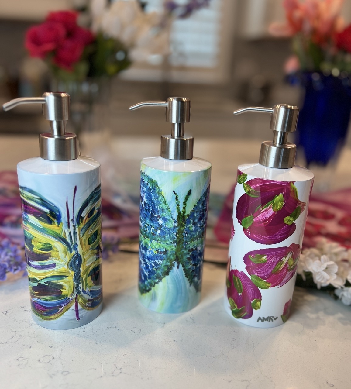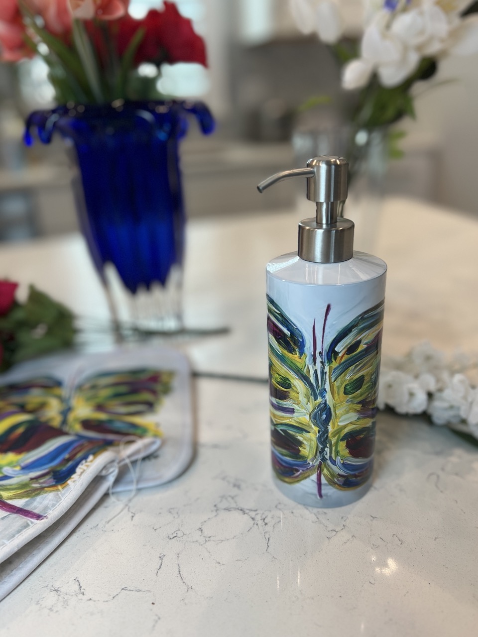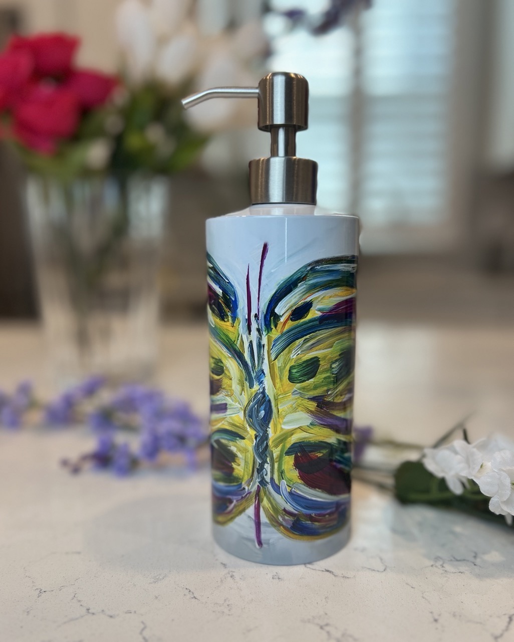 Etienne – One meaning is ‘Royal’, my interpretation of growth, change, strength, beauty emerging in a Monarch butterfly full of vibrance. A colorful pattern on a decorative Soap Dispenser to brighten your kitchen or bath. Inspired from the painting I call, ‘Etienne’