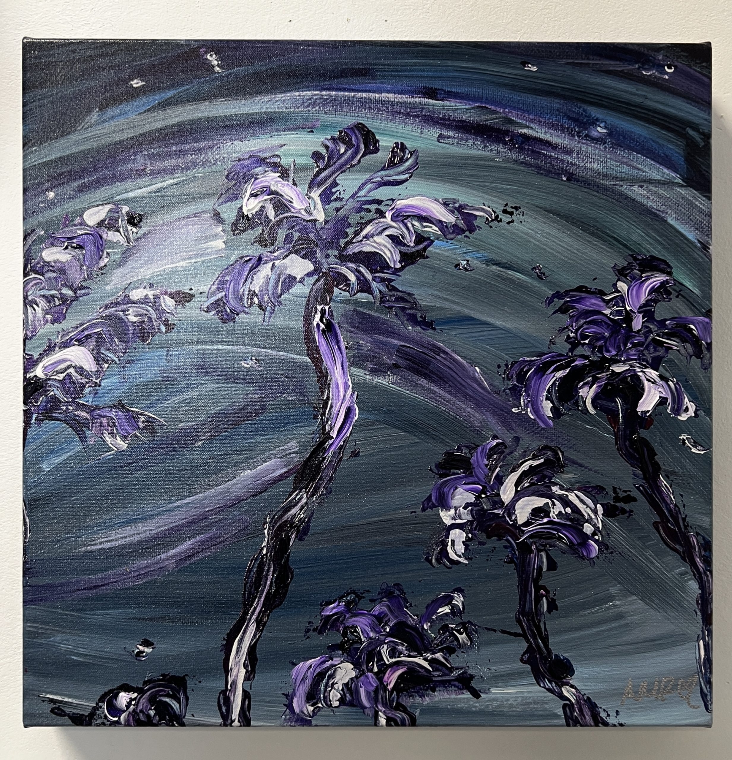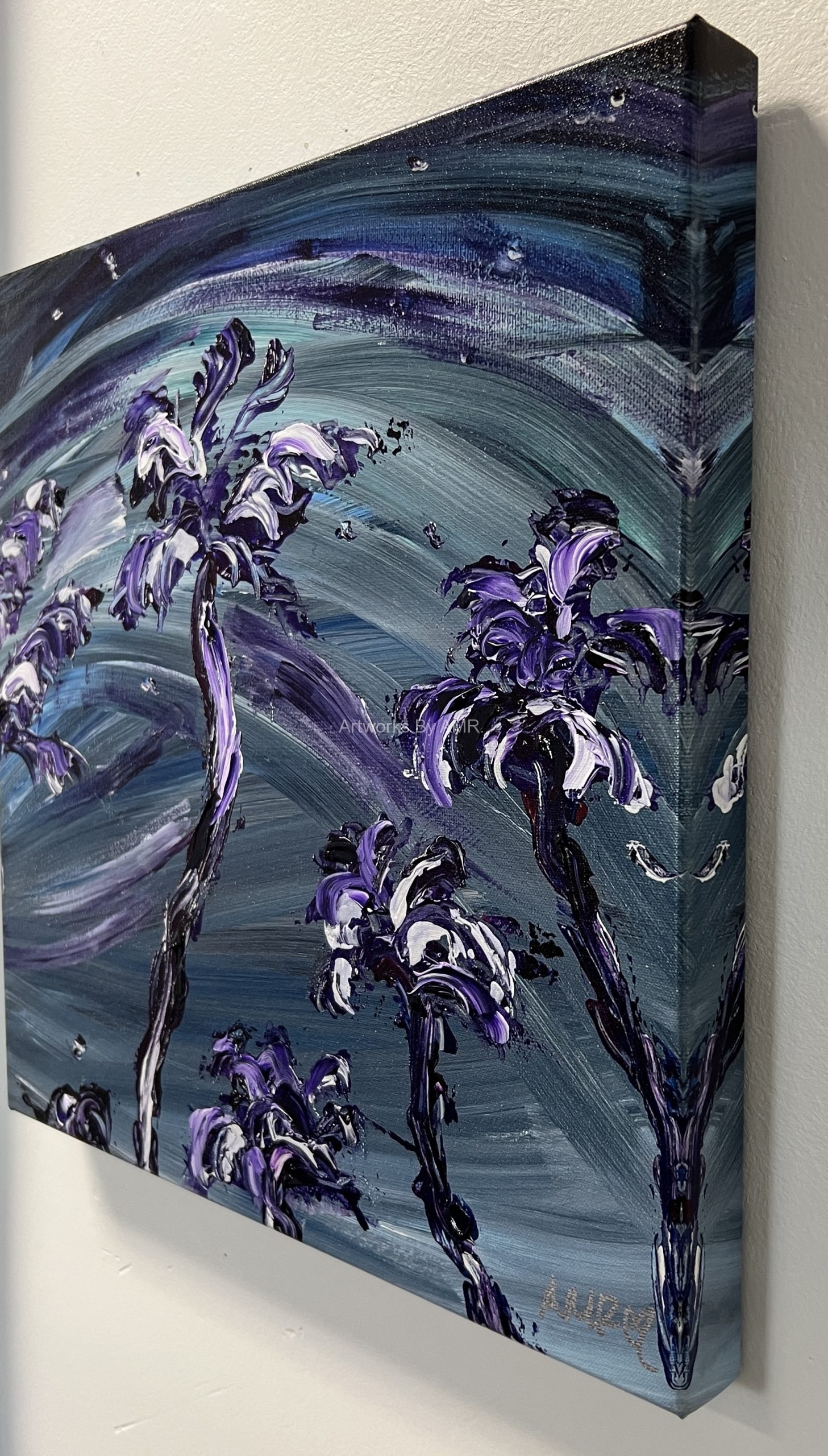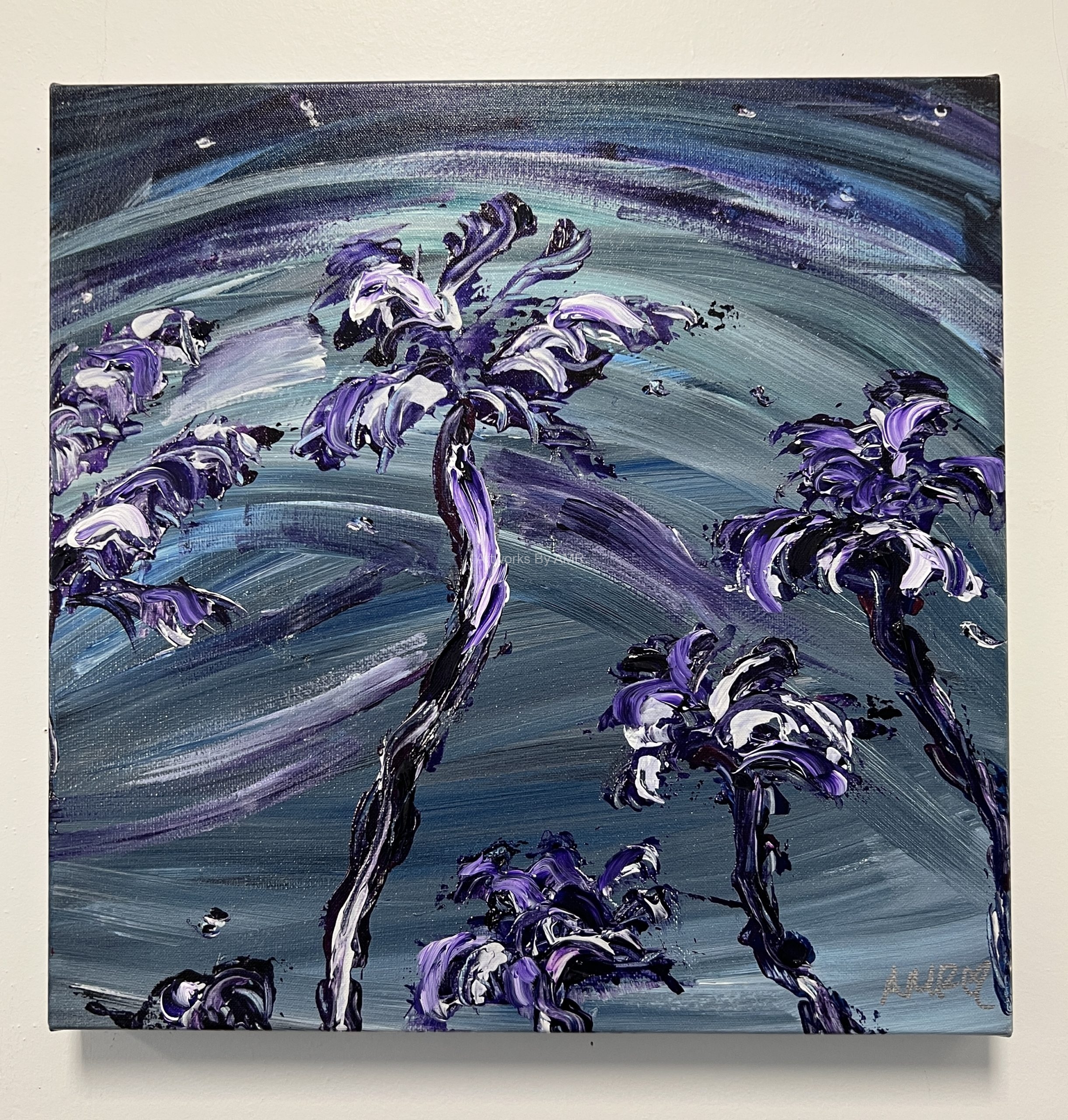 Gazing upon the stars, notice the Milky Way, brilliant among the palms lit by the bright Hawaiian sky. The constant Tradewinds through the palms create a rustling sound, playing alongside the music of the waves rolling in. This painting was inspired by an evening walk on a Maui beach and being taken aback by the beauty overhead and the feel of the gentle breeze.
