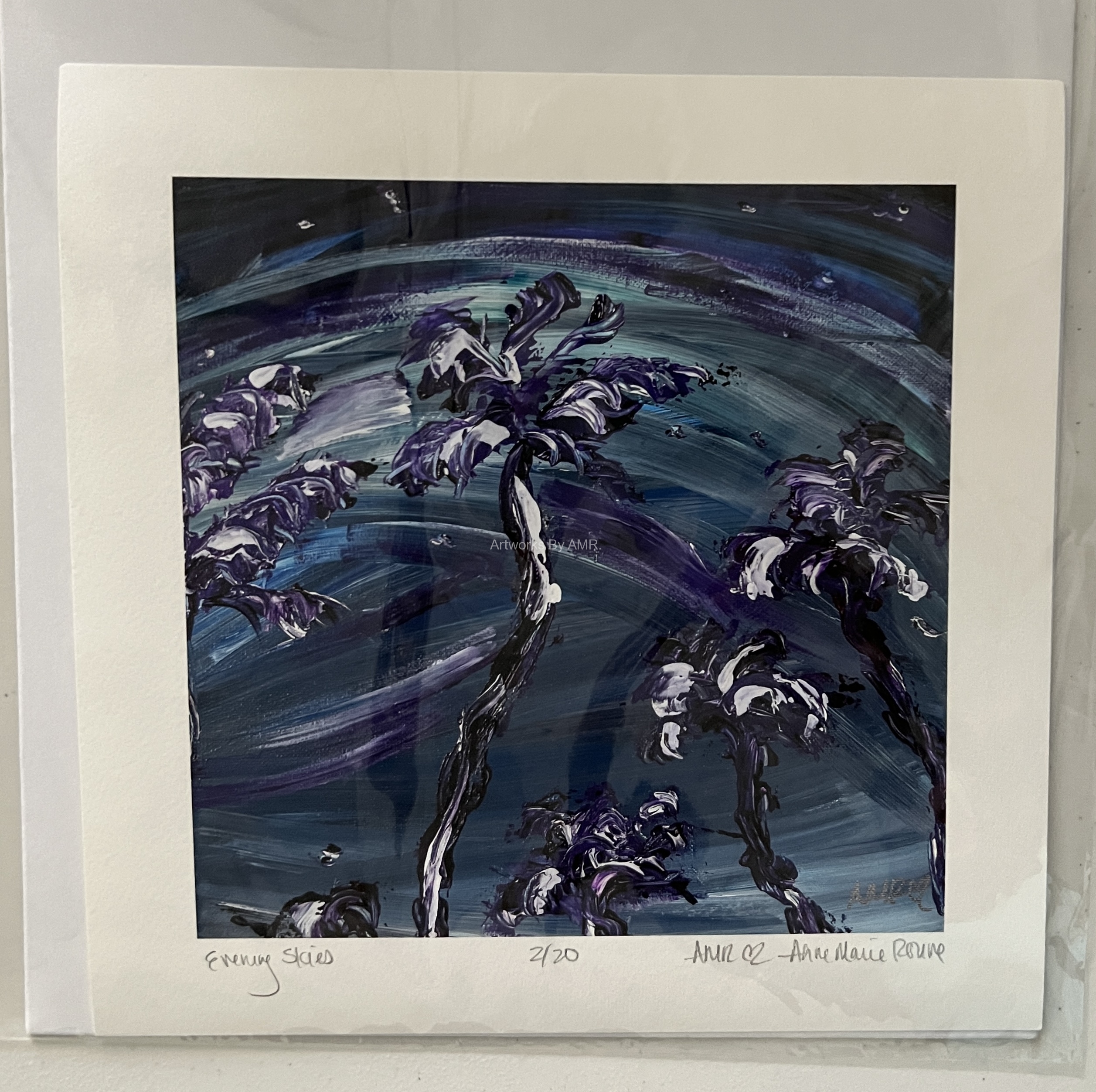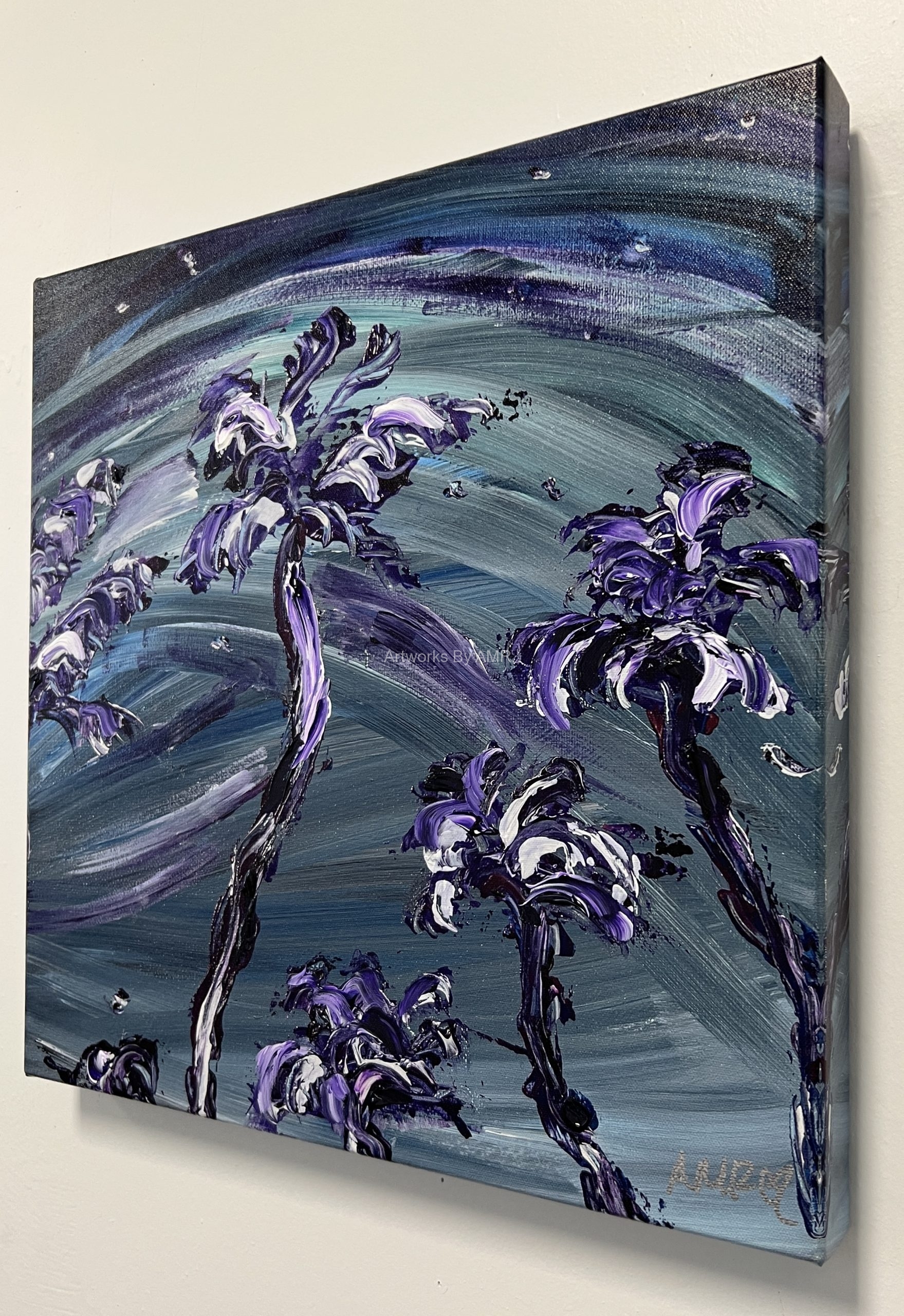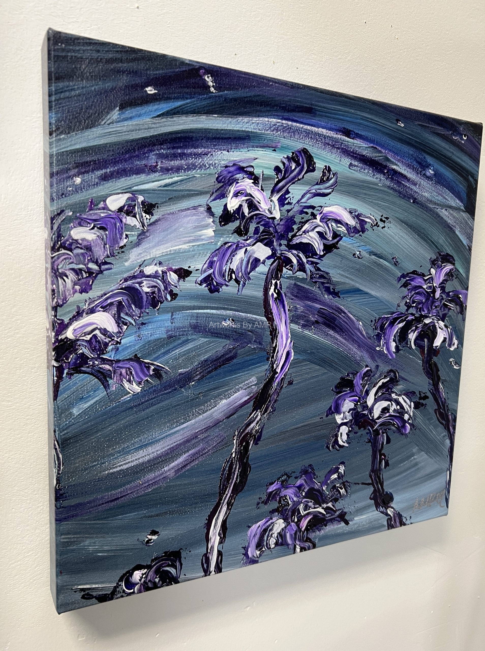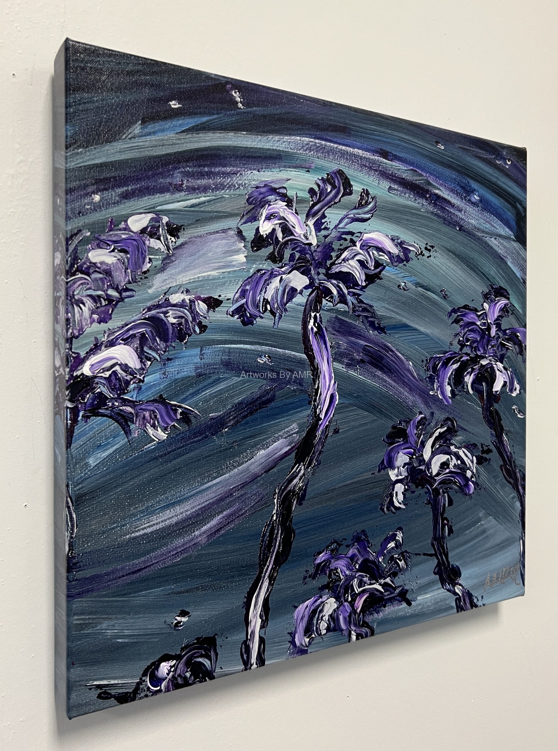 Gazing upon the stars, notice the Milky Way, brilliant among the palms lit by the bright Hawaiian sky. The constant Tradewinds through the palms create a rustling sound, playing alongside the music of the waves rolling in. This painting was inspired by an evening walk on a Maui beach and being taken aback by the beauty overhead and the feel of the gentle breeze.