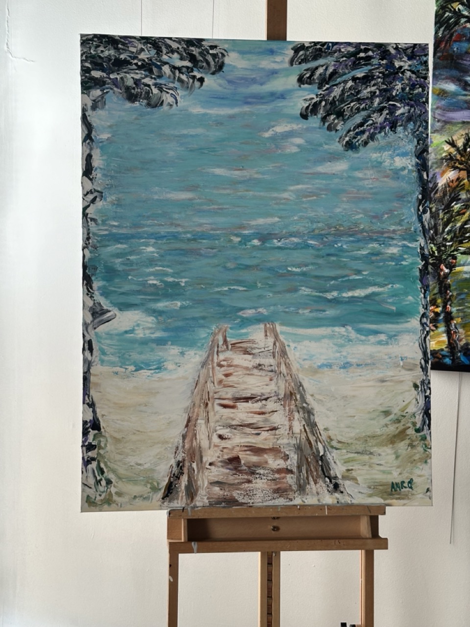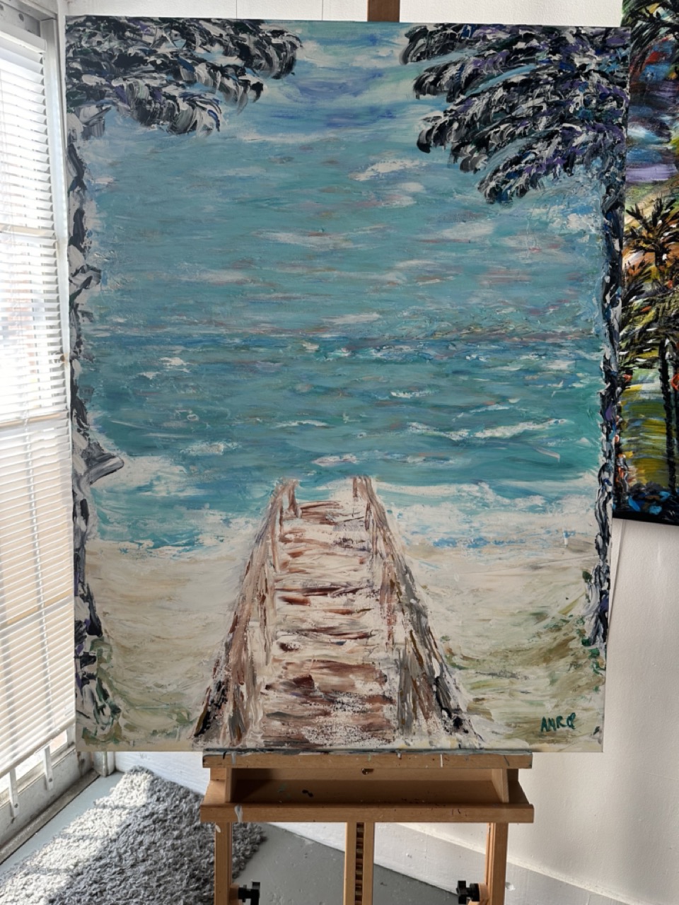 ‘I’ll Meet You There…’ Another of my large Tropical Palms Original Paintings Series. This one inspired by dreaming of where I’d like to be… transported in a flash to the secret spot on the warm sands… waves gently rolling into the shore… a hidden pathway taking you there. And as you look out you see nothing but the vast, tranquil, tropical waters on the horizon.. maybe a hint of another island that may have another similar beach. But this one is the one… I’ll Meet you There…