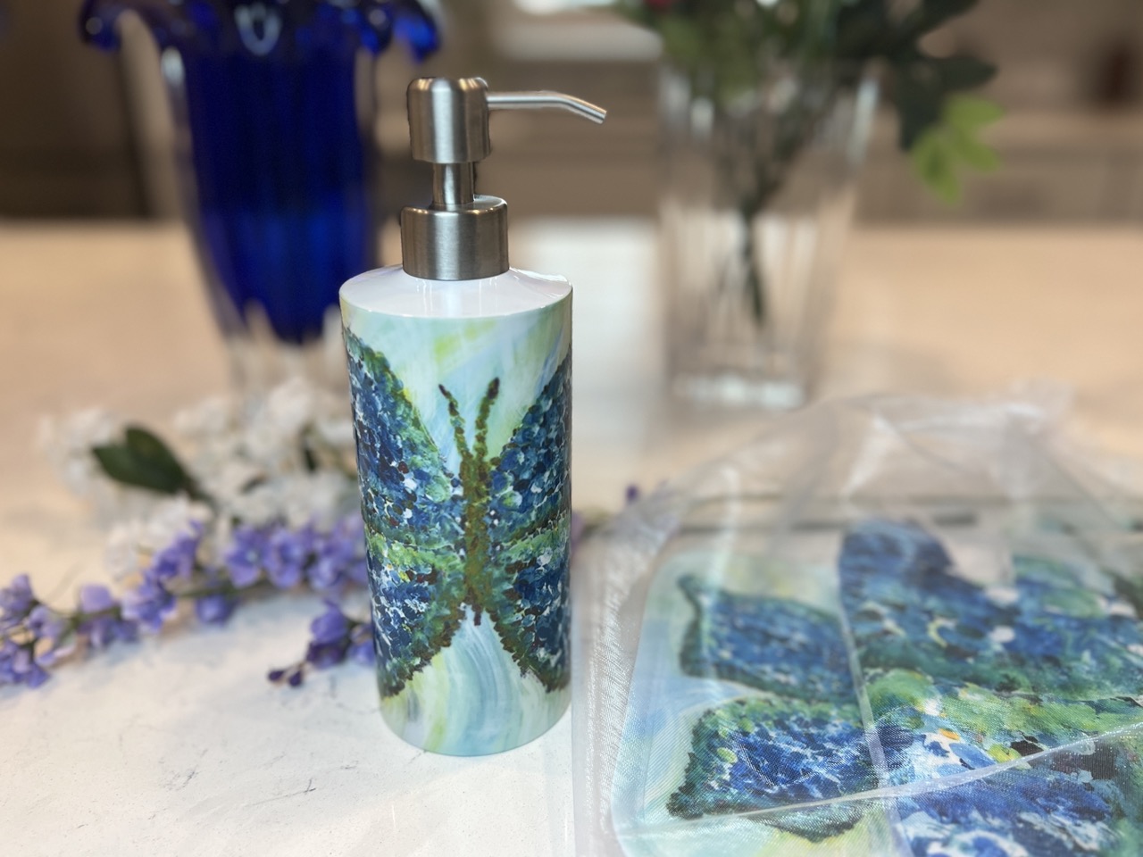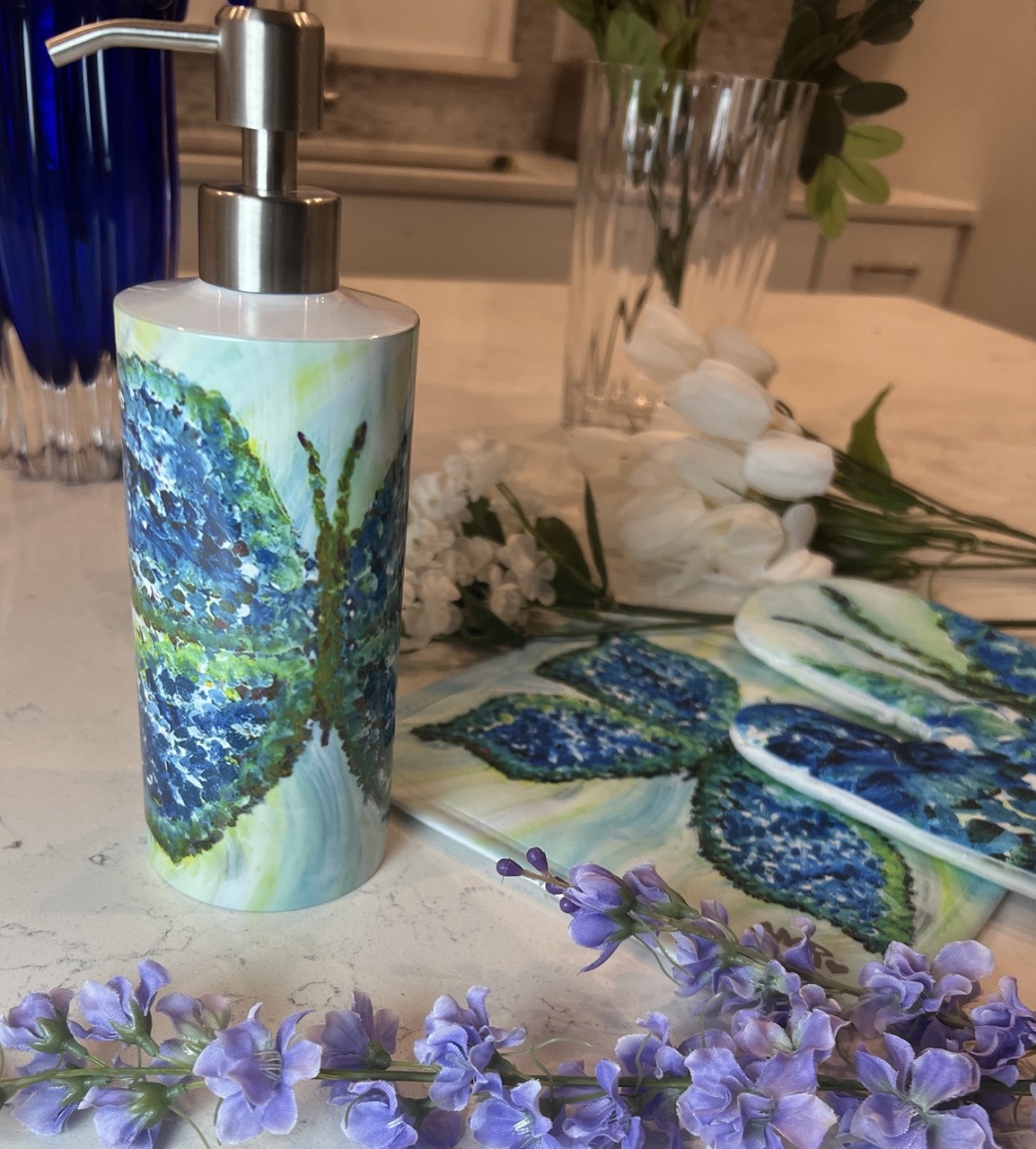 Madama Butterfly -Blue, Beautiful, unique variation of a young monarch. A colorful vibrant pattern on a decorative Soap Dispenser to brighten your kitchen or bath. Inspired from the abstract painting I call, ‘Madama Butterfly’