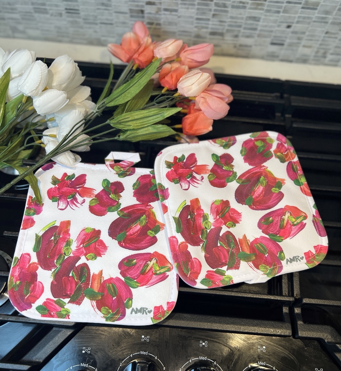 Pitahaya – Dragon Fruit, or Desert Flower in Hawaiian. A colorful vibrant pattern on a set of Pot Holders to brighten your kitchen. Inspired from the abstract painting I call, Pitahaya! Now a part of the Pitahaya Collection!