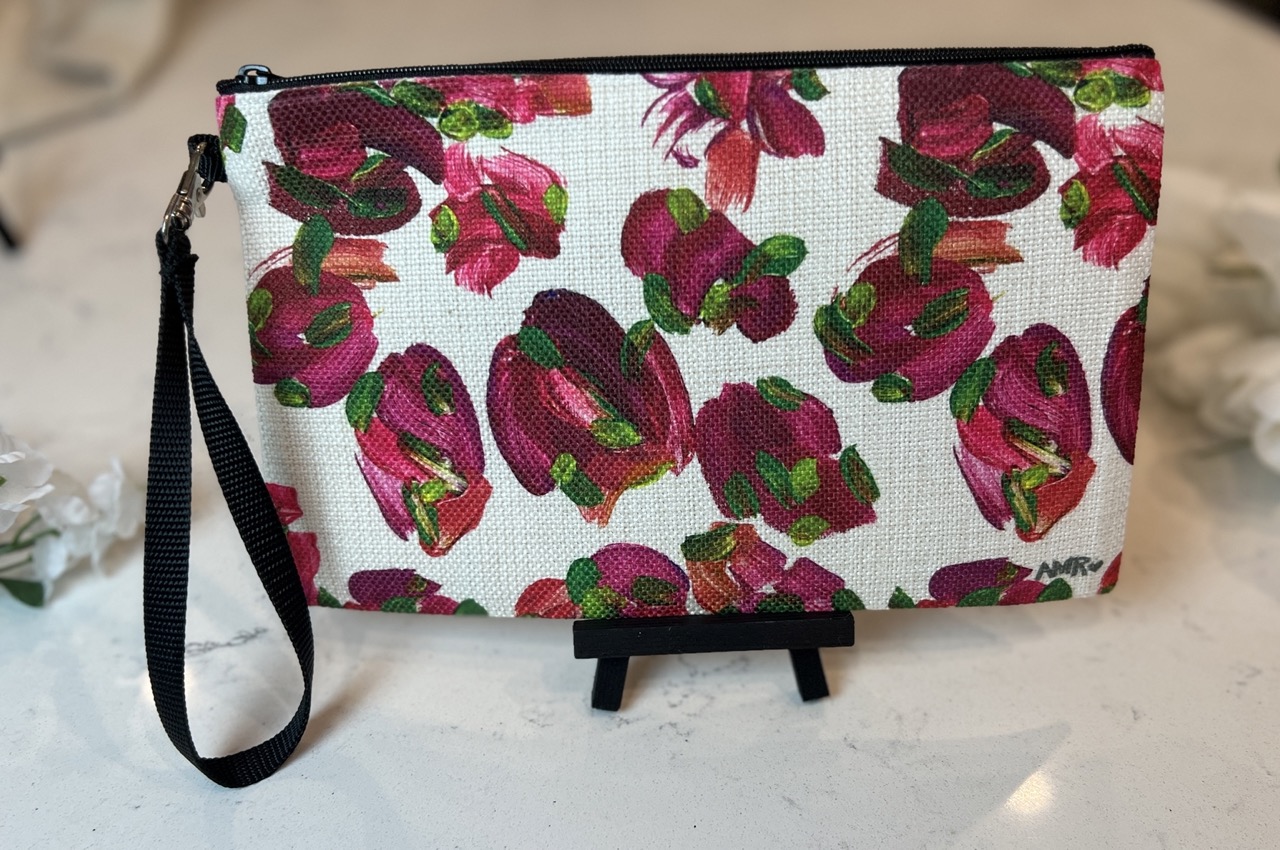 ‘Pitahaya’ – A variation of one of my paintings with a bright, cheerful design. Now on a wearable functional art inspired linen Wristlet/Makeup Bag ! …A Perfect everyday small bag to hold your cell phone, makeup, and other small items. The coordinating coin purse/card holder slips easily inside.