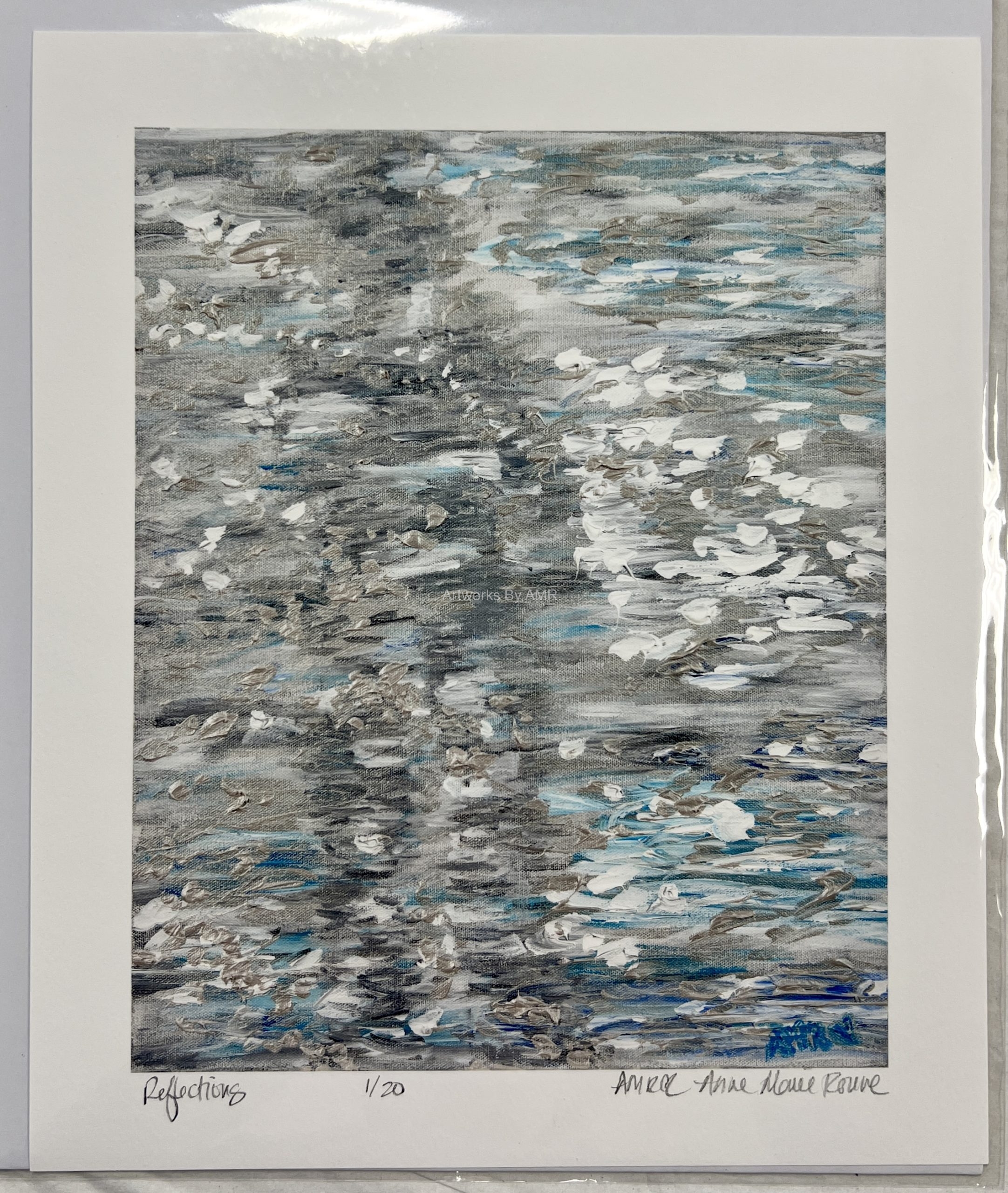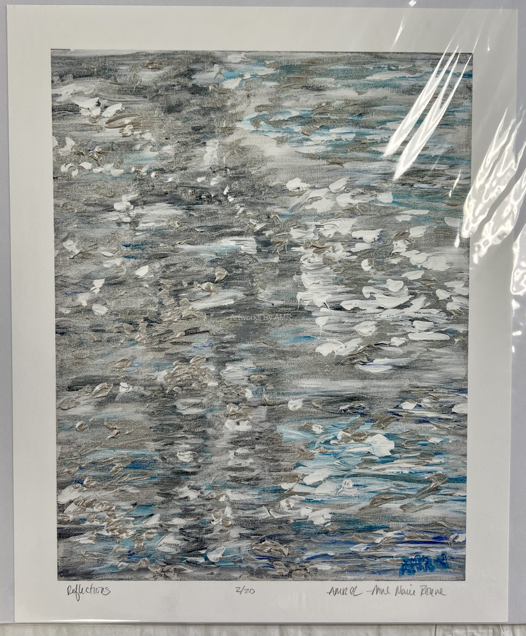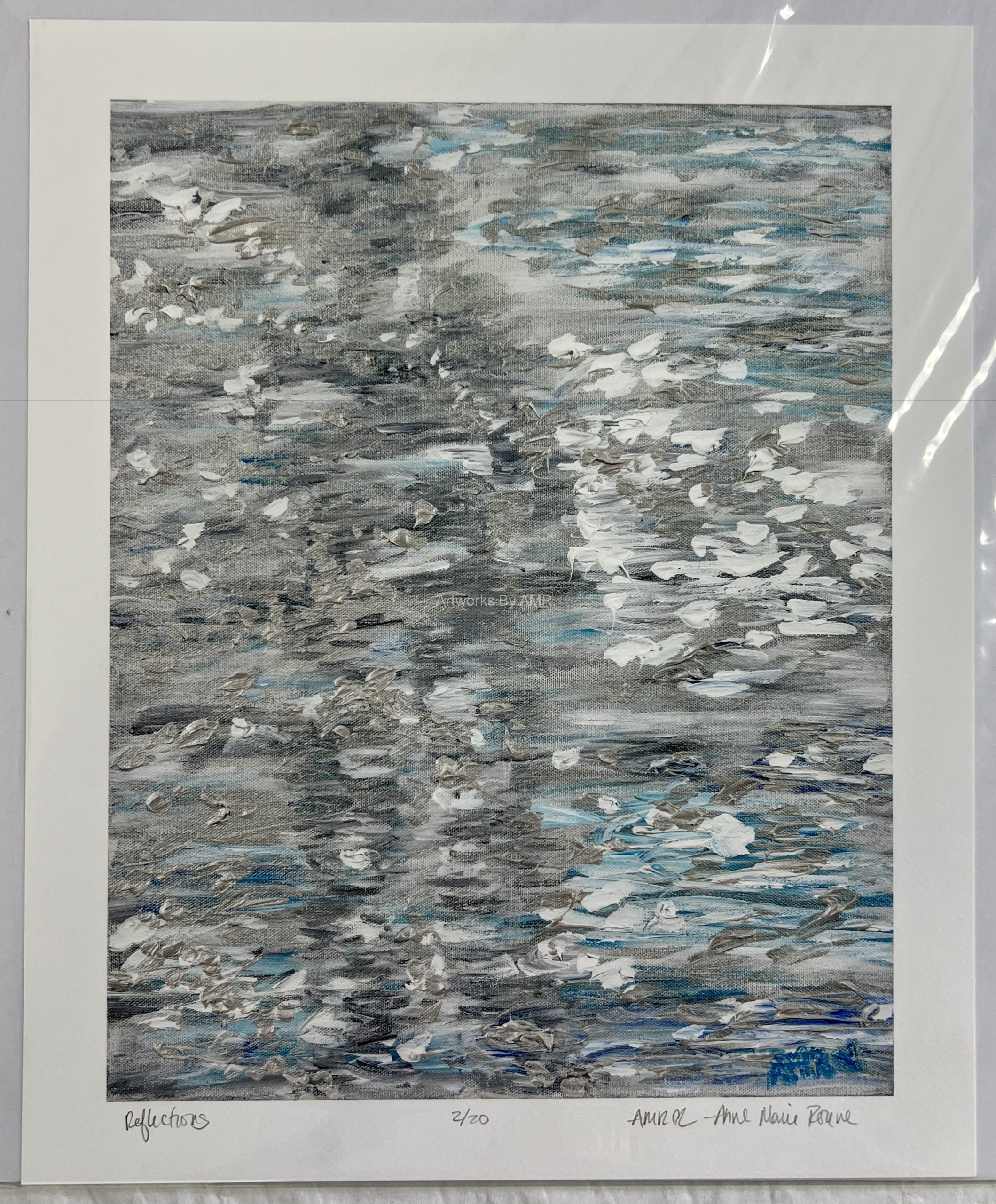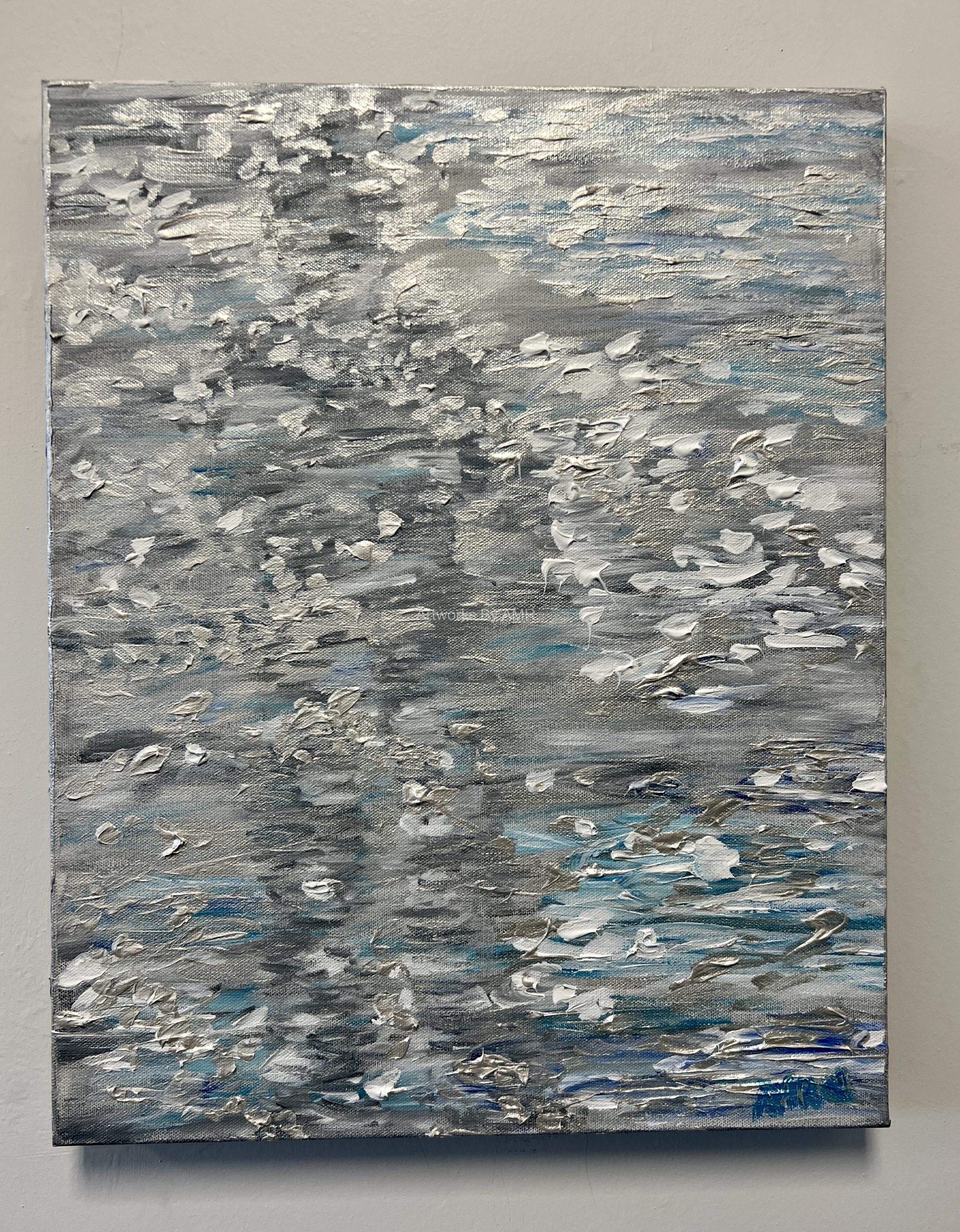 I painted this after capturing some surprising photos while standing in shallow waves during a Palm Beach visit. The reflections that appeared were mesmerizing…peaceful…calm. Hope you enjoy my attempt to share the moment. The painting has shimmers of silver and blues throughout. Enjoy! AMR💜
