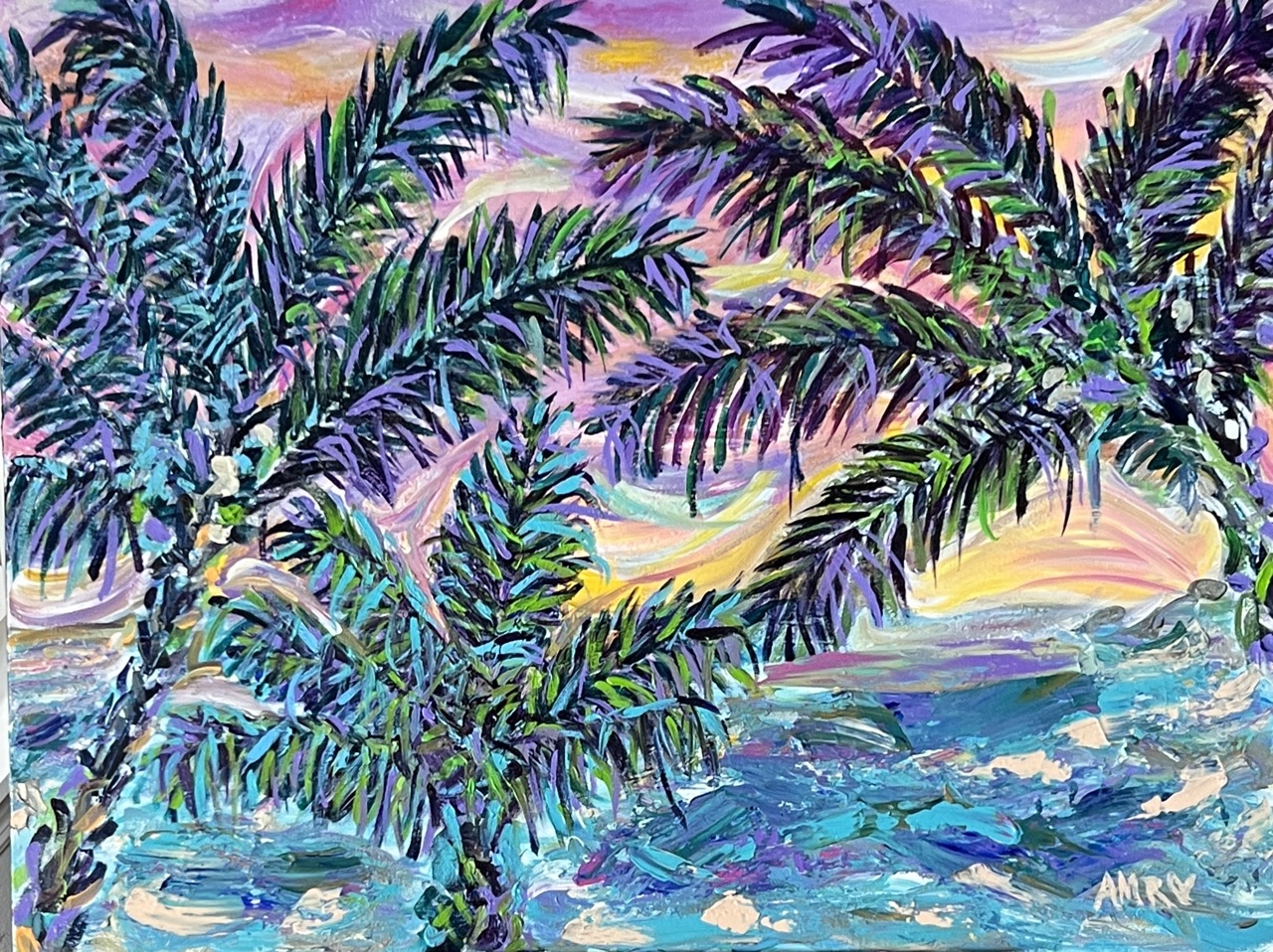‘Reflections of Paradise’ – Newest addition to the Large, Tropical Palms Original Paintings Series.  This one takes me back to another favorite Caribbean Beach….