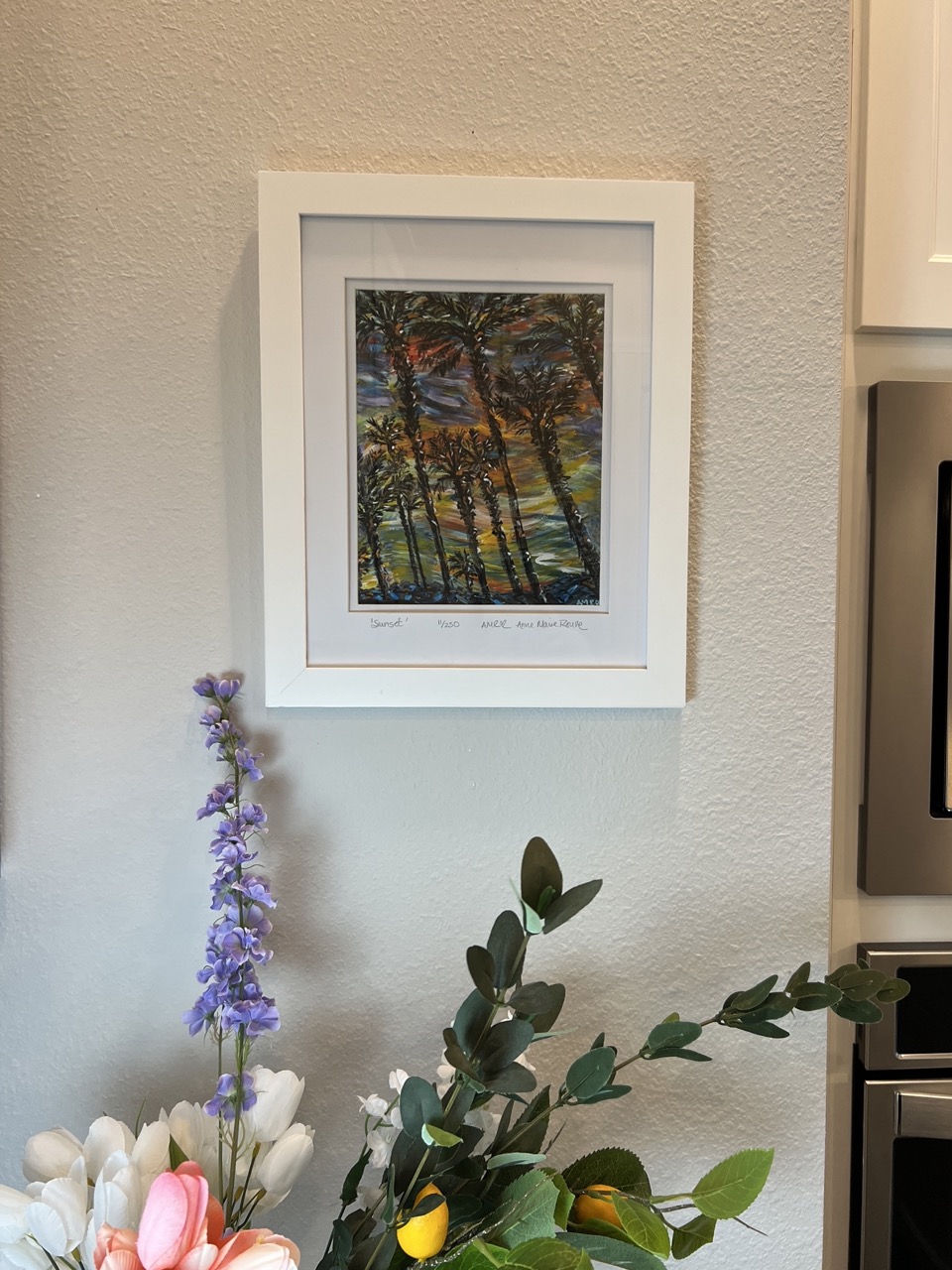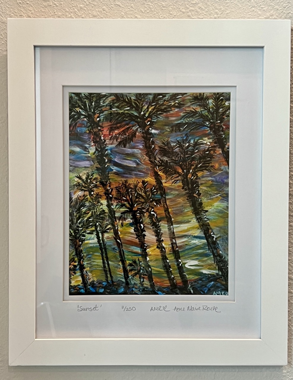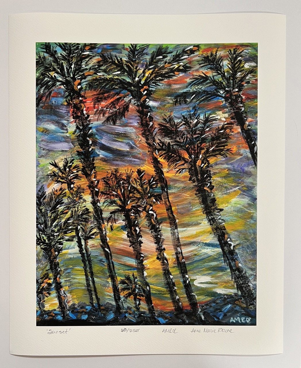 A very vibrant variation of one of my Palm inspired tropical scenes. The trees – some of my favorite among palms, but with a different feel-in a new location. The colors changed so many times over the weeks as this painting was developing… finally landing in a place that I wanted to be, sit, stare and breathe. And… ‘Sunset’ arrived as a beautiful evening in the Tropics! Hope you enjoy!