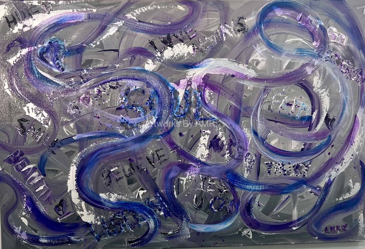 A very large interesting, inspiring, meaningful painting… Life moving through its twists and turns… and the Whispers of the Soul… there if you seek them… keep you on course… moving forward… moving ahead… inspiring you…  Enjoy – AMR 💜